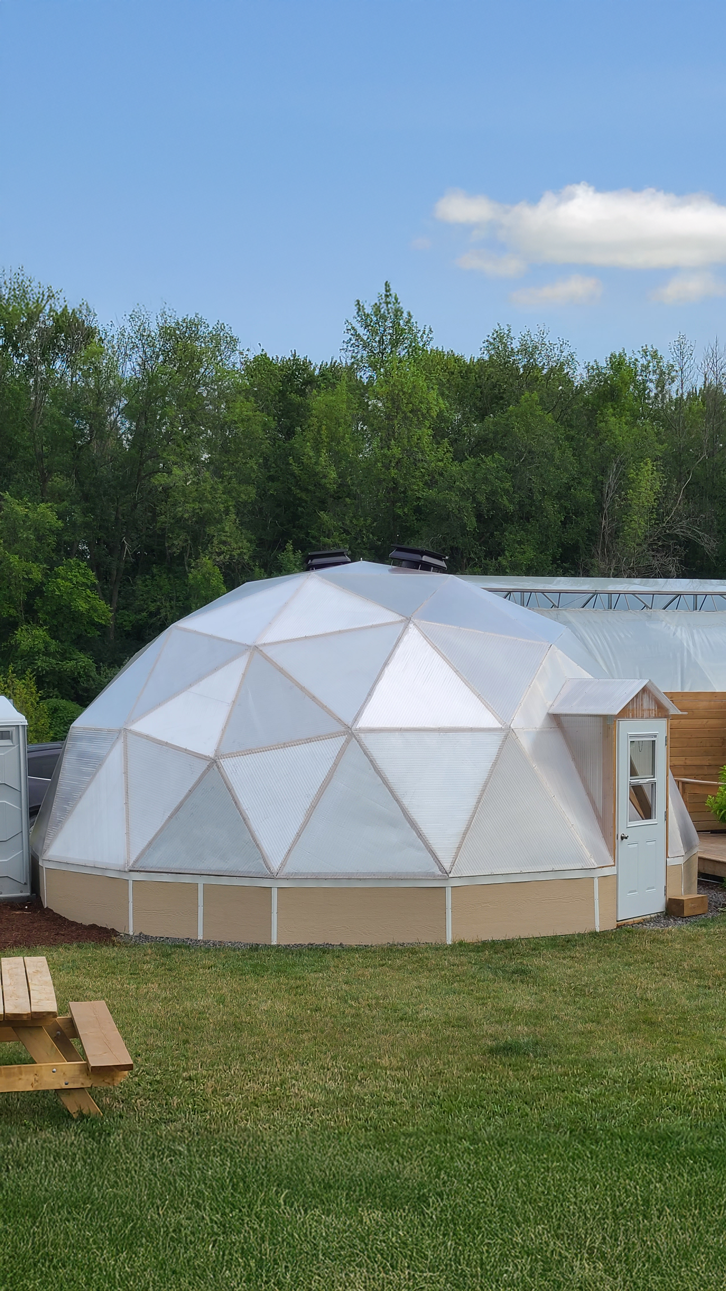 Our first mid-sized dome, this option is suitable for a wide range of purposes. The added height is perfect for home gardeners who want to grow grapes and small trees. With 365 sq ft. of floor space, the 22-foot dome is also well-equipped to be used as a small living space for lodging or glamping. The additional floor area also makes this model a great base-level option for those who want to incorporate a small water feature in the dome.